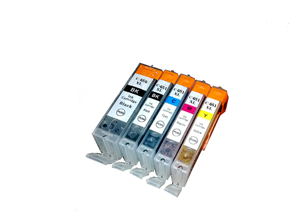 Full set of 5 Compatible CLI-651XL High Capacity Inks, (Black/Cyan/Magenta/Yellow) PLUS a Compatible PGI-650XL Pigment Black Ink This set of ink tanks are for the Canon :
